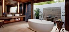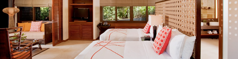 Tastefully done in a minimalist tropical style, the Premier Suite is approximately 110 sqm in size. Each suite comes with a spacious private veranda. Enjoy the sunset and the seascape from your own hidden corner. The ante room is accented with wood and rattan furniture and soft, large cushions. Each luxury suite offers an exquisite bathroom with a European size standalone bathtub and a separate shower. The bedroom comes with a cushy oversized bed, perfect for lounging about the whole day. Separate air-conditioners throughout the suite allow you the option of having both cold and fresh air.
